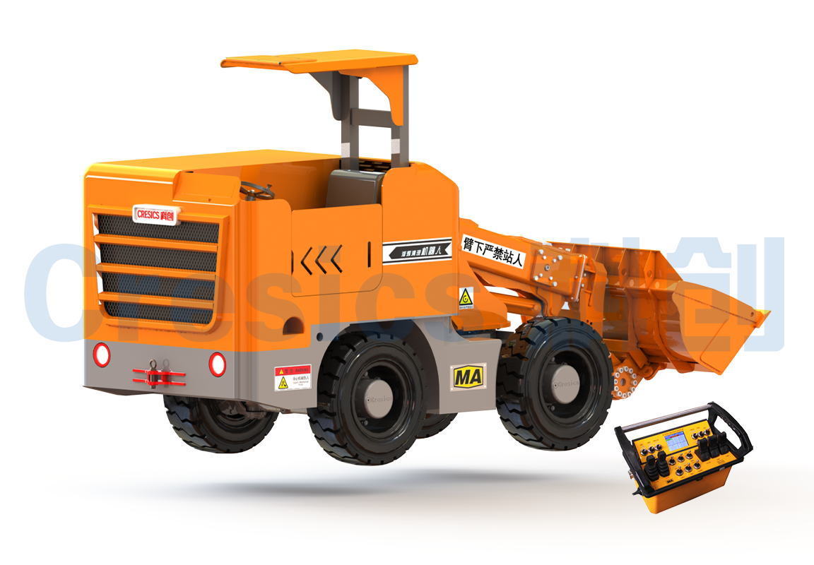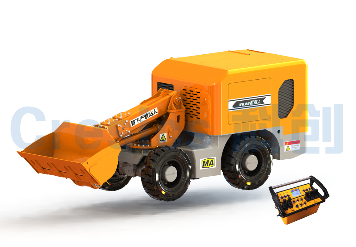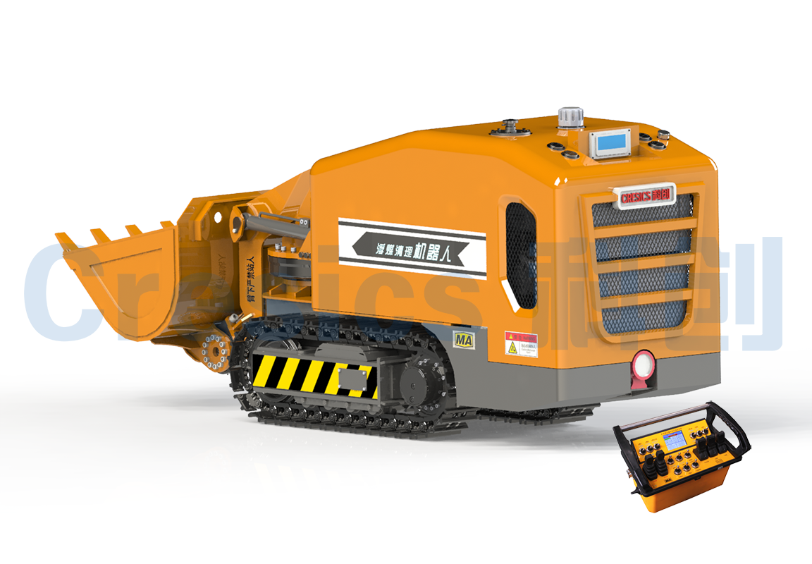 該機(jī)器人主要由行走機(jī)構(gòu)、鏟裝作業(yè)機(jī)構(gòu)、防爆柴油機(jī)動(dòng)力系統(tǒng)、電控系統(tǒng)等部分組成,可實(shí)現(xiàn)無(wú)線(xiàn)遙控 操作、鏟裝作業(yè)、動(dòng)臂回轉(zhuǎn)、鏟斗側(cè)卸等功能,能夠較好的清理狹小空間的浮煤。